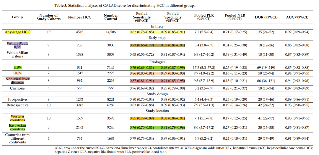 對于識別巴塞羅那臨床肝癌分期(BCLC)0/A期HCC,GALAD模型表現出良好的診斷準確性,敏感度為0.73,特異性為0.87。針對不同病因引發(fā)的肝癌,GALAD模型在乙肝、丙肝及非病毒性肝病相關的肝癌檢測中,其敏感度依次為0.76、0.86和0.87,特異性則為0.96、0.89和0.91。