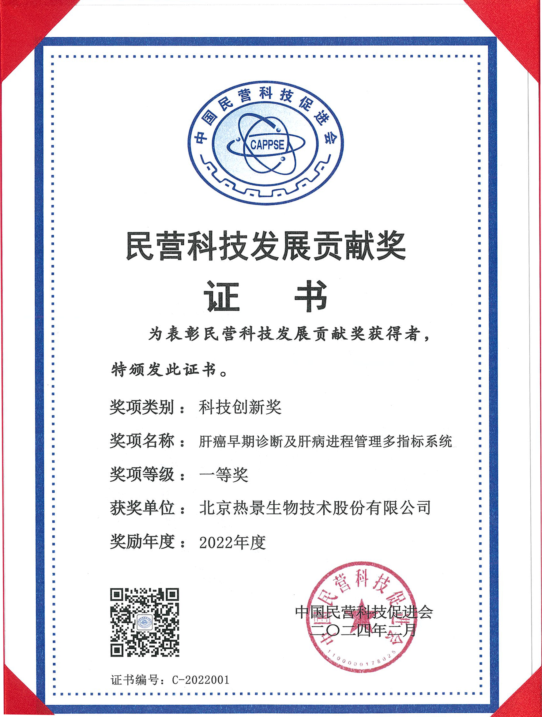 近日,中國(guó)民營(yíng)科技促進(jìn)會(huì)公布了“2022年度民營(yíng)科技發(fā)展貢獻(xiàn)獎(jiǎng)”獲獎(jiǎng)企業(yè)名單,熱景生物“肝癌早期診斷及肝病進(jìn)程管理多指標(biāo)系統(tǒng)”項(xiàng)目榮獲“2022年度民營(yíng)科技發(fā)展貢獻(xiàn)獎(jiǎng)”科技創(chuàng)新一等獎(jiǎng)。