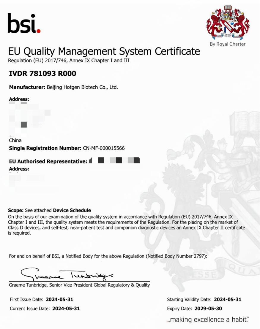 Recently, Hotgen receives its first CE IVDR Certificate for chemiluminescent immunoassays (CLIA) from BSI, one of the most reputable notified bodies for CE certifications of medical devices. This is also the first CE IVDR certificate granted to Chinese mono-test CLIA products. This certificate covers 14 Hotgen mono-test CLIA reagents concerning cardiac, hormones, inflammation, cancer and other important physiological markers, involving both class B and C reagents.