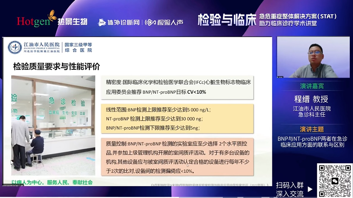 四川省江油市人民醫(yī)院急診科程縉教授就BNP與NT-proBNP兩個指標進行了深入剖析,從BNP與NT-proBNP病理生理機制出發(fā),解析了BNP和NT-proBNP之間的區(qū)別,全面的闡述了影響B(tài)NP和NT-proBNP水平的因素,又從檢驗角度強調(diào)BNP/NT-proBNP質(zhì)量要求和性能評價。最后程教授回歸臨床分享BNP/NT-proBNP在心衰早期篩查與一級預防、心衰的診斷與鑒別診斷和心衰治療監(jiān)測和預后評估等臨床價值。