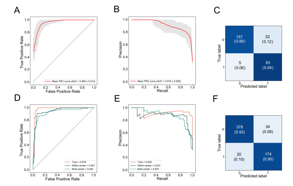 基于發(fā)現(xiàn)隊(duì)列中鑒定出的5個(gè)miRNA的信號(hào)特征,我們構(gòu)建了用于肝癌診斷的數(shù)字診斷模型。多種算法構(gòu)建的模型均展現(xiàn)出卓越的診斷性能。在訓(xùn)練集中,該miRNA組的AUC(ROC曲線下面積)達(dá)到0.978,在中心內(nèi)驗(yàn)證集中為0.943,在多中心驗(yàn)證集中為0.930,且獨(dú)立多中心驗(yàn)證集中的靈敏度和特異性分別達(dá)到0.869和0.892(圖2)。值得注意的是,該miRNA模型在早期肝癌檢測(cè)中表現(xiàn)尤為突出,階段0的靈敏性為85.7%,階段A的靈敏性為90.8%。此外,該模型還能夠識(shí)別88.1%的AFP陰性肝癌樣本,顯著提升了早期肝癌檢測(cè)的準(zhǔn)確性。