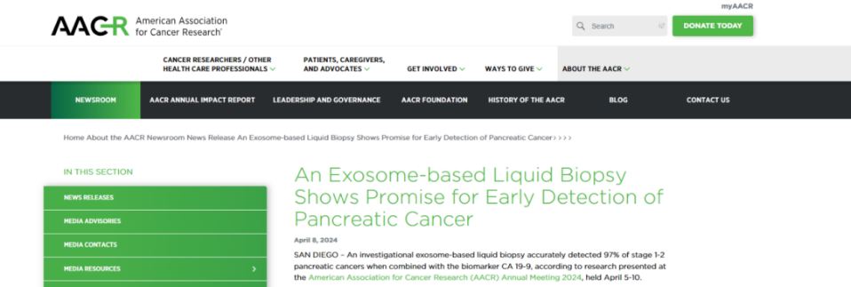 根據(jù)2024美國(guó)癌癥研究協(xié)會(huì)(AACR)年會(huì)上發(fā)表的一項(xiàng)研究,在結(jié)合生物標(biāo)志物CA 19-9的情況下,基于外泌體的液體活檢可準(zhǔn)確檢測(cè)出97%的Ⅰ~Ⅱ期胰腺癌。
