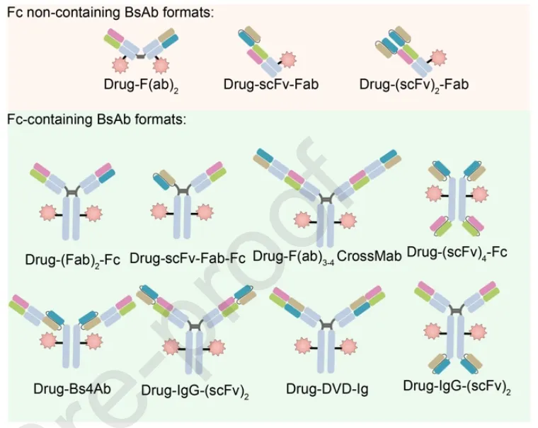 在探討B(tài)sADCs的分類時,F(xiàn)c區(qū)的存在與否是一個關(guān)鍵的區(qū)分標(biāo)準(zhǔn)。不包含F(xiàn)c區(qū)的BsADCs在設(shè)計(jì)上可能會遇到穩(wěn)定性不足、容易聚集以及缺乏有效的偶聯(lián)位點(diǎn)等問題。而含有Fc區(qū)的BsADCs則能夠帶來一系列額外的好處,如抗體依賴性細(xì)胞介導(dǎo)的細(xì)胞毒性(ADCC)、補(bǔ)體依賴性細(xì)胞毒性(CDC)、免疫吞噬作用以及細(xì)胞因子的釋放,這些都有助于增強(qiáng)對腫瘤的殺傷能力。以下是構(gòu)建含有Fc區(qū)的BsADCs的策略: