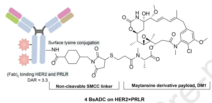 采用"Knobs-into-Holes"(KIH)技術(shù),設(shè)計(jì)了一種含有HER2特異臂和PRLR特異臂的雙特異性抗體(Bispecific Antibody, BsAb)。這種BsADC通過在其表面賴氨酸上引入不可裂解的連接子(如N-succinimidyl 4-(maleimidomethyl)cyclohexane-1-carboxylate, SMCC),將DM1(一種抗有絲分裂藥物)與抗體連接起來,形成平均藥物抗體比率(DAR)為3.324的BsADC。研究表明,即使PRLR在細(xì)胞表面的表達(dá)水平低于HER2,也足以引發(fā)持續(xù)的內(nèi)化作用和隨后的溶酶體降解過程。這表明高周轉(zhuǎn)率的表面靶標(biāo),即便表達(dá)水平不高,也能有效地促進(jìn)內(nèi)化和溶酶體降解,從而可能提高BsADCs的療效。