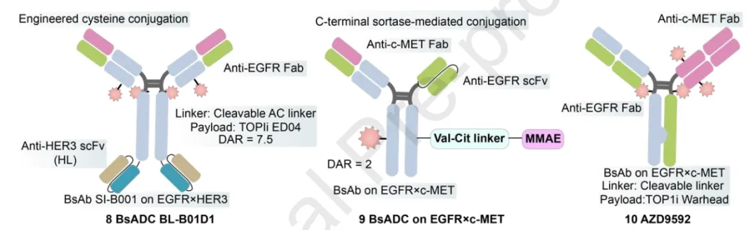 目前,BsADCs的研究焦點(diǎn)主要集中在HER2、EGFR和c-MET等靶點(diǎn)上。在ADC的構(gòu)成中,抗體、連接子和有效載荷每個部分都需要經(jīng)過精心的獨(dú)立優(yōu)化。對這些關(guān)鍵組成部分的任何微小調(diào)整,都可能對藥物的臨床特性產(chǎn)生顯著的影響。因此,在設(shè)計(jì)新一代的BsADCs時,應(yīng)該將抗體、連接子-藥物復(fù)合物的優(yōu)化和偶聯(lián)技術(shù)視為一個相互關(guān)聯(lián)的系統(tǒng),這要求采用一種全局性的策略來進(jìn)行綜合考慮。