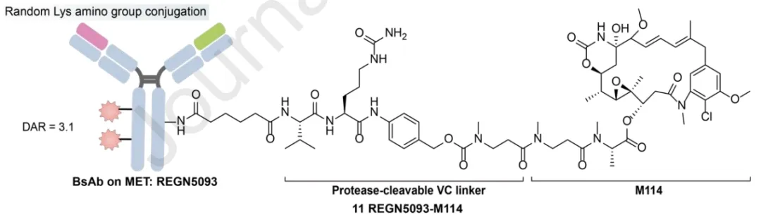 與傳統(tǒng)的MET靶向抗體藥物偶聯(lián)物(ADC)相比,雙表位MET×MET-BsADC的設(shè)計(jì)提供了一種創(chuàng)新的解決方案來應(yīng)對現(xiàn)有挑戰(zhàn)。這種雙抗原抗體能夠形成2:2的抗原-抗體復(fù)合物,從而促進(jìn)MET的有效內(nèi)化和溶酶體轉(zhuǎn)運(yùn)。REGN5093-M114通過蛋白酶可裂解的連接子將Maytansinoid類有效載荷M114與靶向MET的雙特異性抗體(BsAb)的表面賴氨酸偶聯(lián),產(chǎn)生了平均藥物抗體比(DAR)為3.12的BsADC。