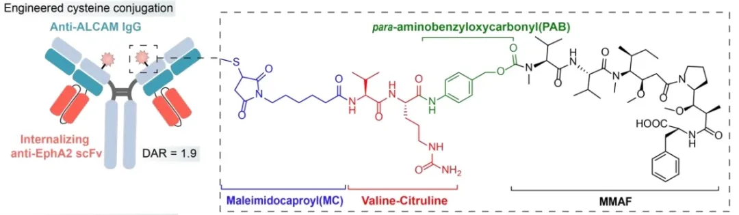 MC-VC-pab-MMAF這一有效載荷復(fù)合物通過半胱氨酸殘基的位點(diǎn)特異性偶聯(lián)技術(shù)實(shí)現(xiàn)。在BsADCs的雙重特異性結(jié)合作用下,內(nèi)化效果可能會因同時靶向的相鄰抗原而顯著變化,這與它們的表達(dá)比例密切相關(guān)。這種特性擴(kuò)展了抗原選擇的廣度,使得原本內(nèi)化能力較弱的BsADCs設(shè)計(jì)成為可能。這種創(chuàng)新的方法為增強(qiáng)某些抗原的內(nèi)化能力提供了一種精細(xì)的策略,增強(qiáng)了BsADCs對更廣泛腫瘤抗原的多功能性和有效性。