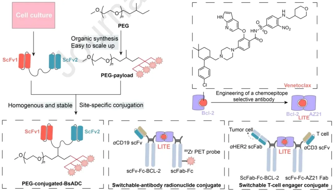 技術(shù)的創(chuàng)新為BsADCs的制備帶來了革命性的變化,并展現(xiàn)出顯著的優(yōu)勢。特別是PEG化的BsADC(P-BsADC)的發(fā)展,它不僅確保了偶聯(lián)的一致性,而且由于其較小的分子尺寸和缺乏Fc片段,展現(xiàn)出更高的內(nèi)吞效率、組織滲透能力以及較低的毒性。
