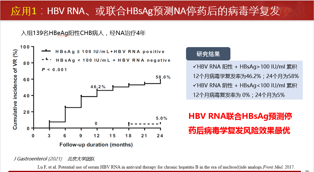 臨床應(yīng)用方面指導(dǎo)安全停藥;NA治療下患者血清HBV RNA檢測(cè)陽性預(yù)示更高的HCC發(fā)生風(fēng)險(xiǎn);NA治療下患者血清HBV RNA檢測(cè)陽性,提示病毒cccDNA仍在有效轉(zhuǎn)錄表達(dá)病毒蛋白、組裝子代病毒顆粒樣pgRNA病毒顆粒。