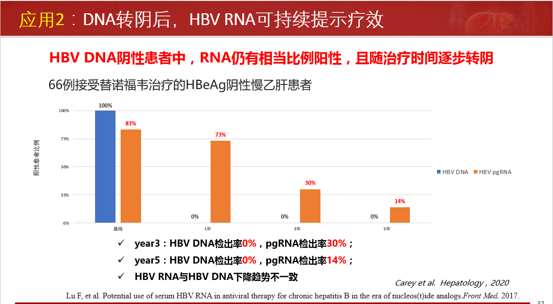 關(guān)于HBV RBA病毒樣顆粒的發(fā)現(xiàn)、血清HBV RNA的產(chǎn)生路徑、存在形式、來源和特點(diǎn)等做了詳細(xì)闡述,同時(shí)分享國內(nèi)肝病領(lǐng)域張文宏研究團(tuán)隊(duì)等工作成果,血清HBV RNA水平反映肝內(nèi)cccDNA的轉(zhuǎn)錄活性,血清 HBV pgRNA,是NA治療下HBV DNA < LLOQ后,能夠反映患者肝組織內(nèi)是否有cccDNA活躍轉(zhuǎn)錄的唯一指標(biāo)。