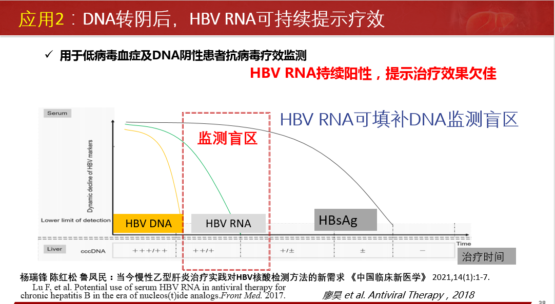 ★ 用于低病毒血癥及DNA陰性患者抗病毒療效監(jiān)測(cè);HBV RNA可填補(bǔ)HBV DNA監(jiān)測(cè)盲區(qū),HBV DNA轉(zhuǎn)陰后可持續(xù)提示療效,HBV RNA持續(xù)陽性,提示治療效果欠佳。