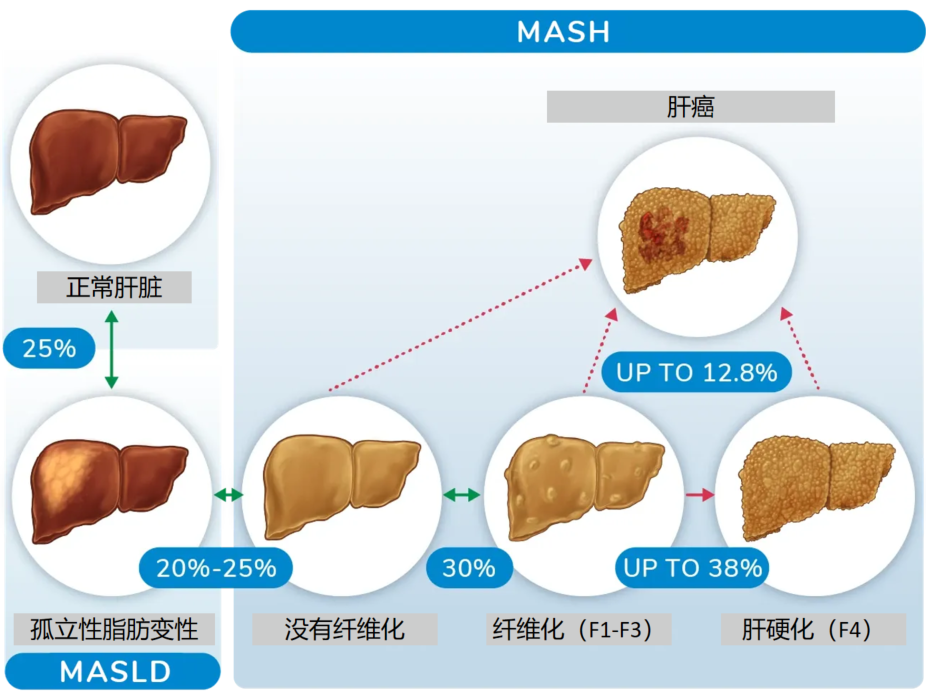 MASLD疾病譜包括單純性脂肪肝(MAFL)、脂肪性肝炎(MASH)及其相關(guān)纖維化和肝硬化。隨著肥胖和2型糖尿病(T2DM)的流行,全球MASLD患病率和發(fā)病率不斷增高。據(jù)報(bào)道,全球MASLD的發(fā)病率約20-35%,其中約10-30%的患者患有MASH。