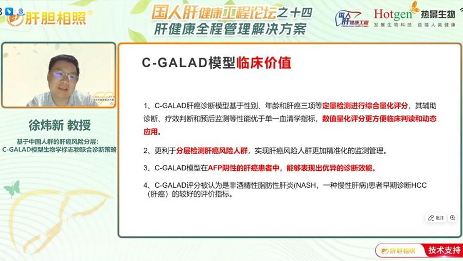 上海交通大學(xué)醫(yī)學(xué)院附屬仁濟醫(yī)院嘉定分院檢驗科的徐煒新教授圍繞肝癌早篩技術(shù)革新發(fā)表主題報告,他深入解析C-GALAD模型的臨床價值與應(yīng)用前景,為肝癌防控提供新策略?,F(xiàn)狀與突破----我國肝癌早期診斷率低,傳統(tǒng)超聲聯(lián)合AFP檢測對早期小肝癌敏感性不足?;凇逗D鲜≡缙诟伟┖Y查實施方案》將“肝癌三項”(AFP、AFP-L3%、異常凝血酶原)納入常規(guī)篩查,徐主任指出,多標志物聯(lián)合檢測成為破局關(guān)鍵:AFP-L3%提升惡性鑒別特異性,異常凝血酶原(DCP)反映腫瘤侵襲性,三者互補顯著提高早診效能。 C-GALAD模型:本土化創(chuàng)新典范----針對中國80%以上肝癌由乙肝驅(qū)動的人群特征,熱景生物研發(fā)的C-GALAD模型,整合年齡、性別與“肝癌三項”定量數(shù)據(jù),通過算法生成風(fēng)險評分,實現(xiàn)三大優(yōu)勢:①精準分層:量化評分指導(dǎo)高危人群分級管理(如肝硬化患者每6個月聯(lián)合超聲篩查);②動態(tài)監(jiān)測:評分變化早于影像學(xué)提示復(fù)發(fā)風(fēng)險,助力療效評估;③指南推薦:獲《原發(fā)性肝癌診療指南(2024年版)》認可,成為輔助診斷核心工具。臨床與政策協(xié)同---國內(nèi)外指南均強調(diào)風(fēng)險分層管理。徐主任呼吁推動“C-GALAD+超聲”聯(lián)合篩查普及,并展望未來融合液體活檢、AI影像技術(shù),構(gòu)建普惠化早篩體系。