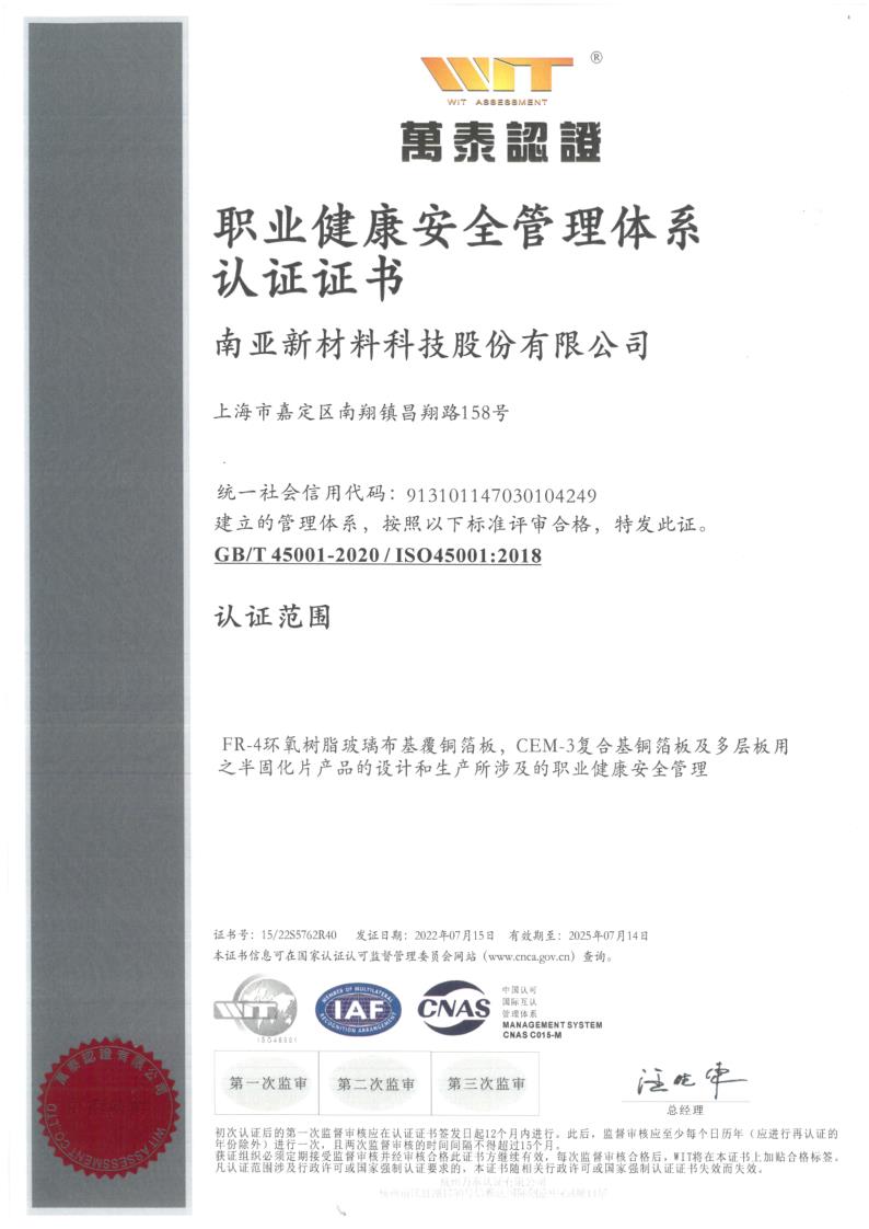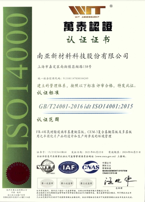 南亞新材始終堅(jiān)持質(zhì)量就是生命,持續(xù)不斷的改進(jìn)生產(chǎn)技術(shù)和服務(wù)水平,不斷完善質(zhì)量管理體系,務(wù)求滿足并超越不同客戶的要求和期望;經(jīng)過不懈的努力,公司先后通過了ISO9001質(zhì)量管理體系、 ISO14001環(huán)境管理體系和ISO45001職業(yè)健康安全管理體系的認(rèn)證及改版升級(jí)。